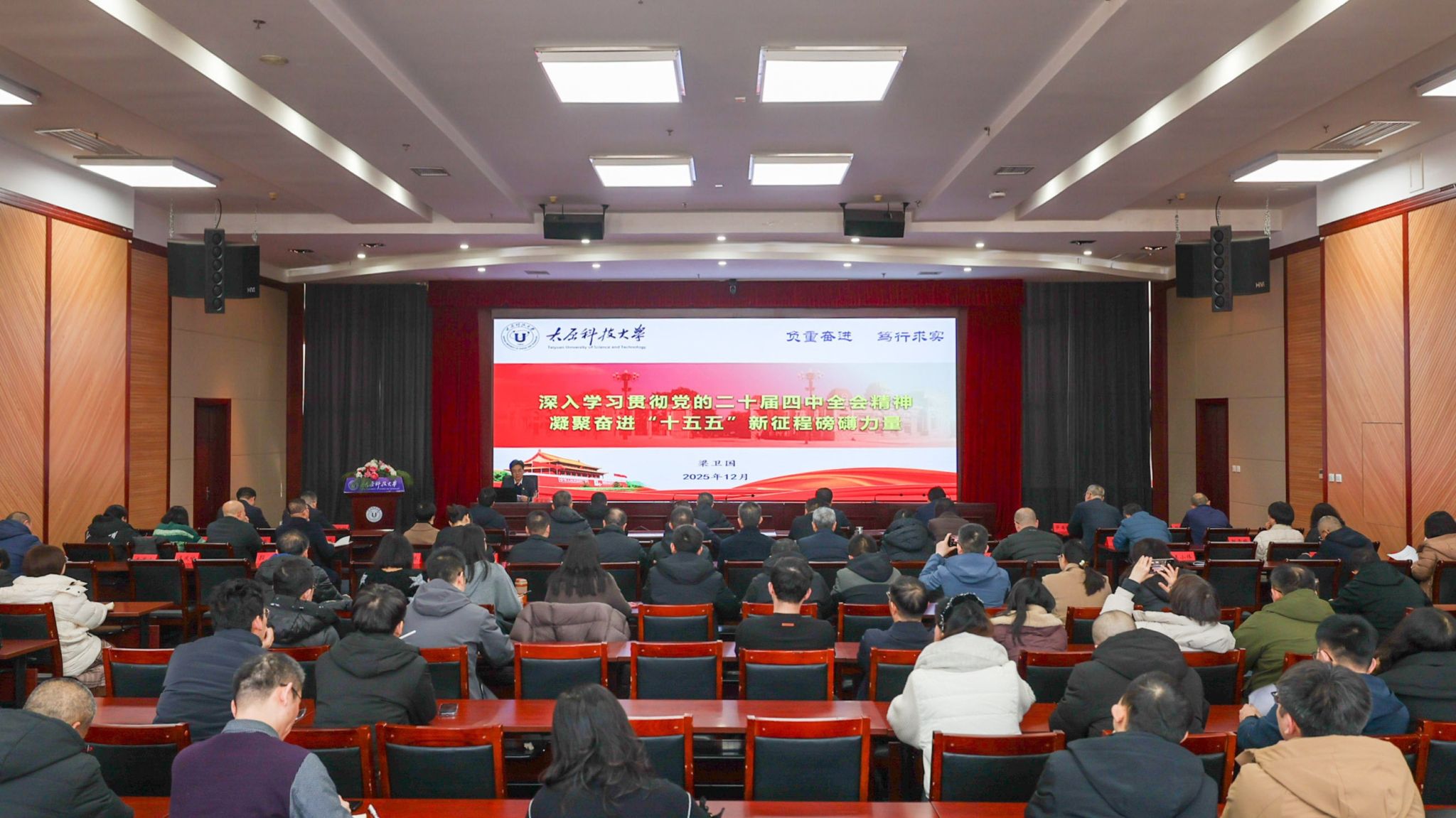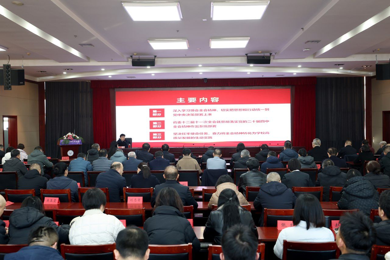 12月19日上午,校党委书记白培康在博学楼16层会议室宣讲党的二十届四中全会精神,校领导、全校处级干部、师生代表聆听宣讲。白培康以《深入学习贯彻党的二十届四中全会精神 实现“十四五”圆满收官和“十五五”顺利开局》为题,从“深入学习领会全会精神,切实把思想和行动统一到党中央决策部署上来”“省委十二届十一次全会就贯彻落实党的二十届四中全会精神作出系统部署”“坚决扛牢使命任务,奋力将全会精神转化为学校高质量...