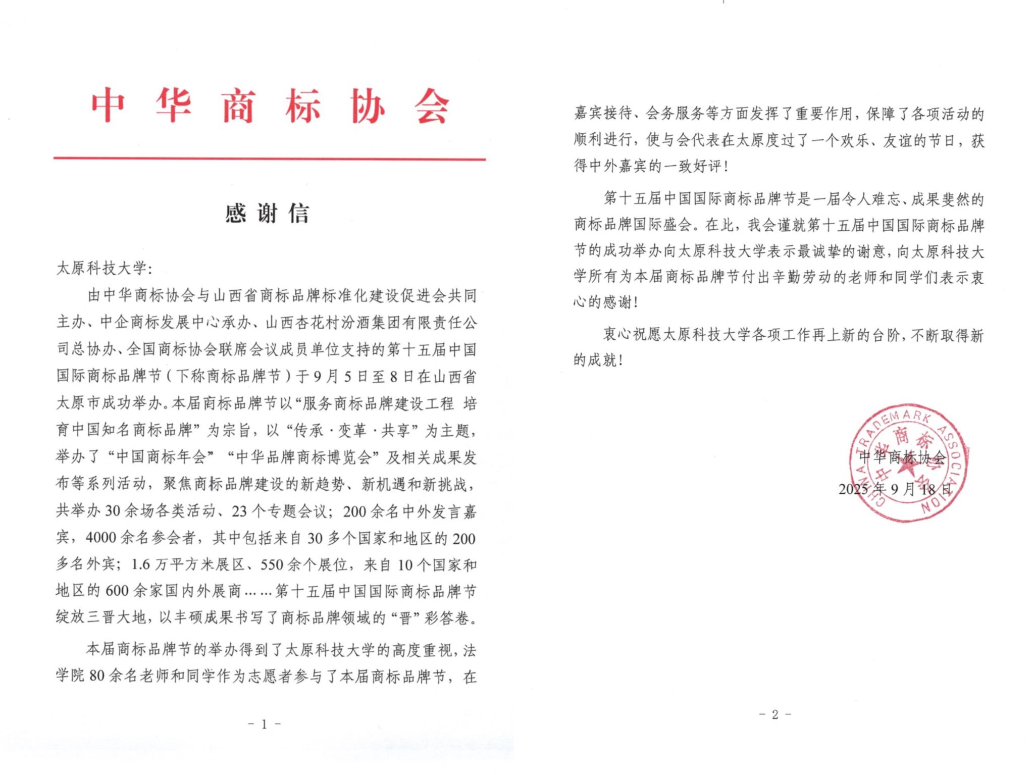 此次国际商标品牌节志愿者活动,不仅展现了太阳成官网学生的良好精神风貌和专业素养,也为推动商标品牌事业的发展贡献了一份青春力量,赢得了参展商、嘉宾以及主办方的一致好评,更收到了中华商标协会的感谢信。此次活动是太阳成官网知识产权专业教学与实践相结合的一次成功尝试,也为太阳成官网学生提供了在实践中锻炼能力、增长了见识的机会。志愿者们纷纷表示,通过这次活动,他们深刻体会到了志愿服务的意义和价值,未来将继续积极参与各类志愿活动,用所学知识服务社会,传递爱心与温暖。