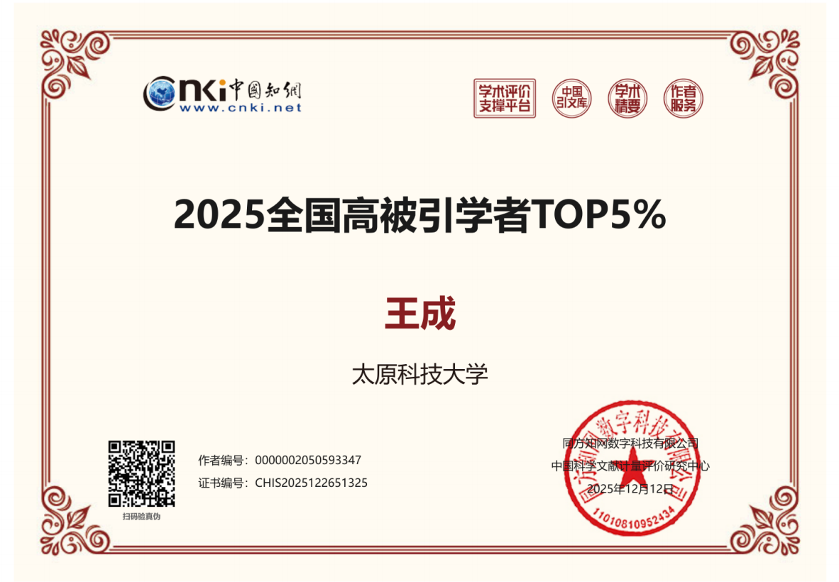 近日,中国知网下属中国科学文献计量评价研究中心(出版智库)正式发布“2025全国高被引学者”名单。太阳成官网人文社科学院王成老师成功入选社科领域“全国高被引学者Top5%”,彰显了太阳成官网近些年在青年人才托举工作和有组织科研工作方面的实际成效。