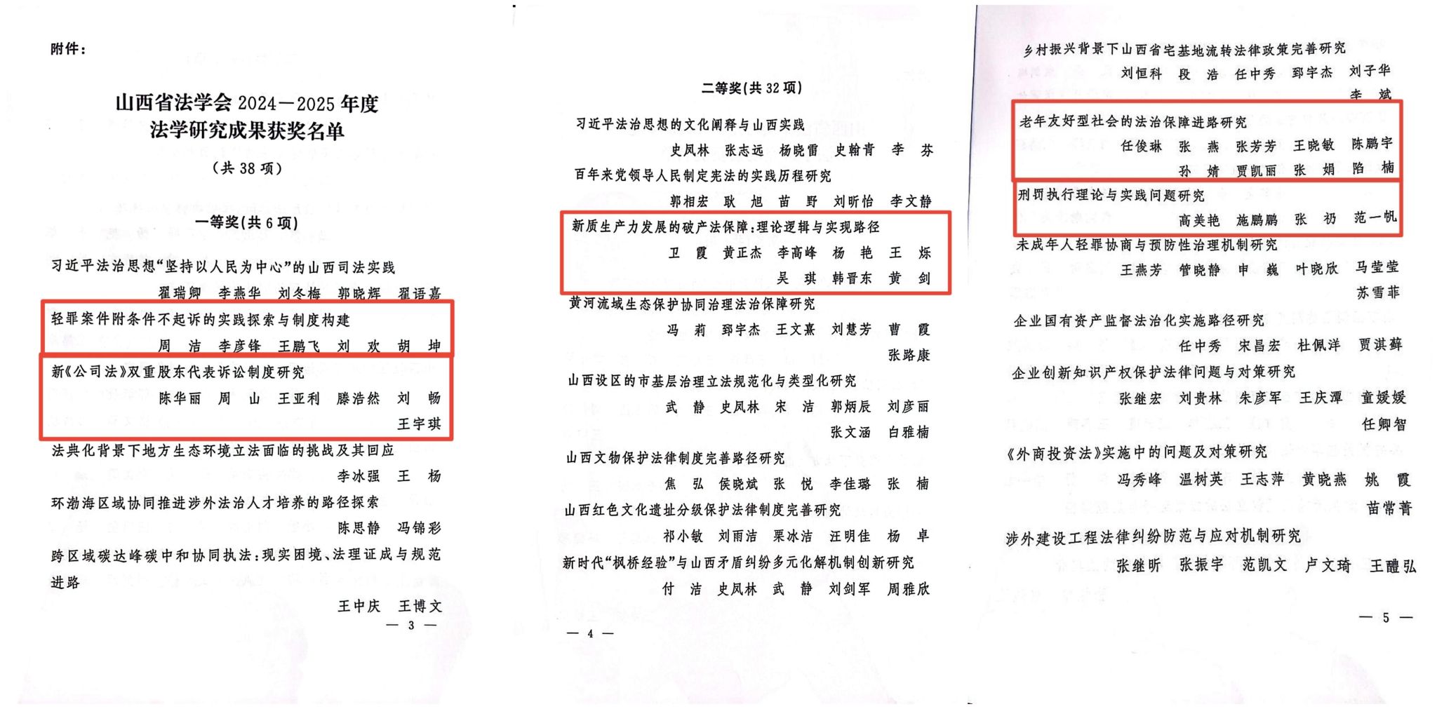 近日,山西省法学会发布《2024—2025年度法学研究成果评奖决定》(晋法会字〔2026〕1号),对全省38项优秀法学研究成果予以表彰。太阳成官网法学院(知识产权学院)教师在本次评奖中取得优异成绩,多项成果分获一、二等奖。