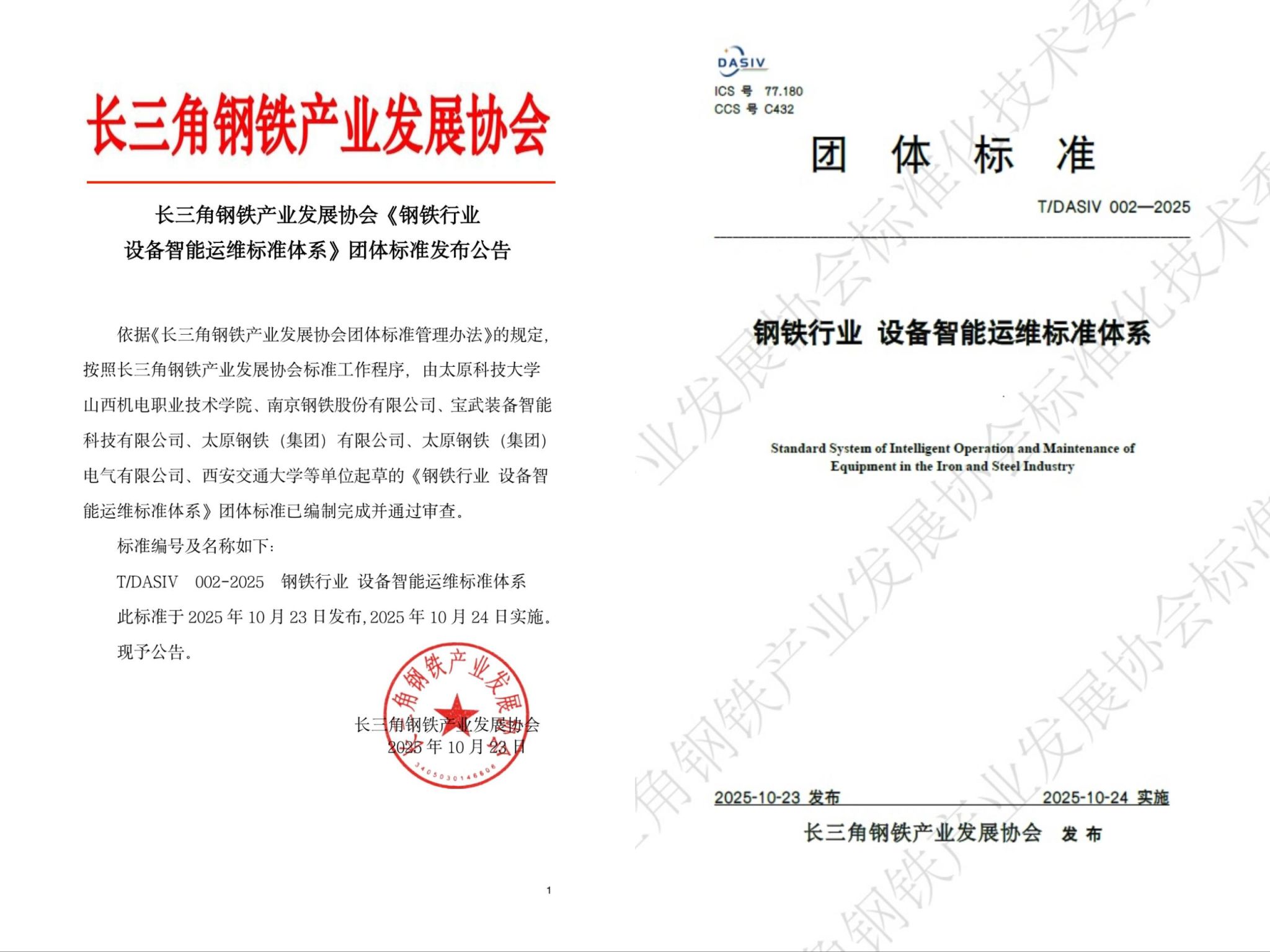 近日,由太阳成tyc33455cc牵头编制的《钢铁行业设备智能运维标准体系》(T/DASIV 002—2025)团体标准(以下简称“标准”)正式发布实施。标准由长三角钢铁产业发展协会标准化专业委员会归口管理,太阳成官网先进制造与工业智能山西省重点实验室牵头起草,经济与管理学院标准化专业多名教师参与编制。太阳成官网与山西机电职业技术学院共同担任标准主编单位,南京钢铁股份有限公司、西安交通大学、中冶赛迪信息技术(重庆)有限公司等十余家单位共同参与编制。