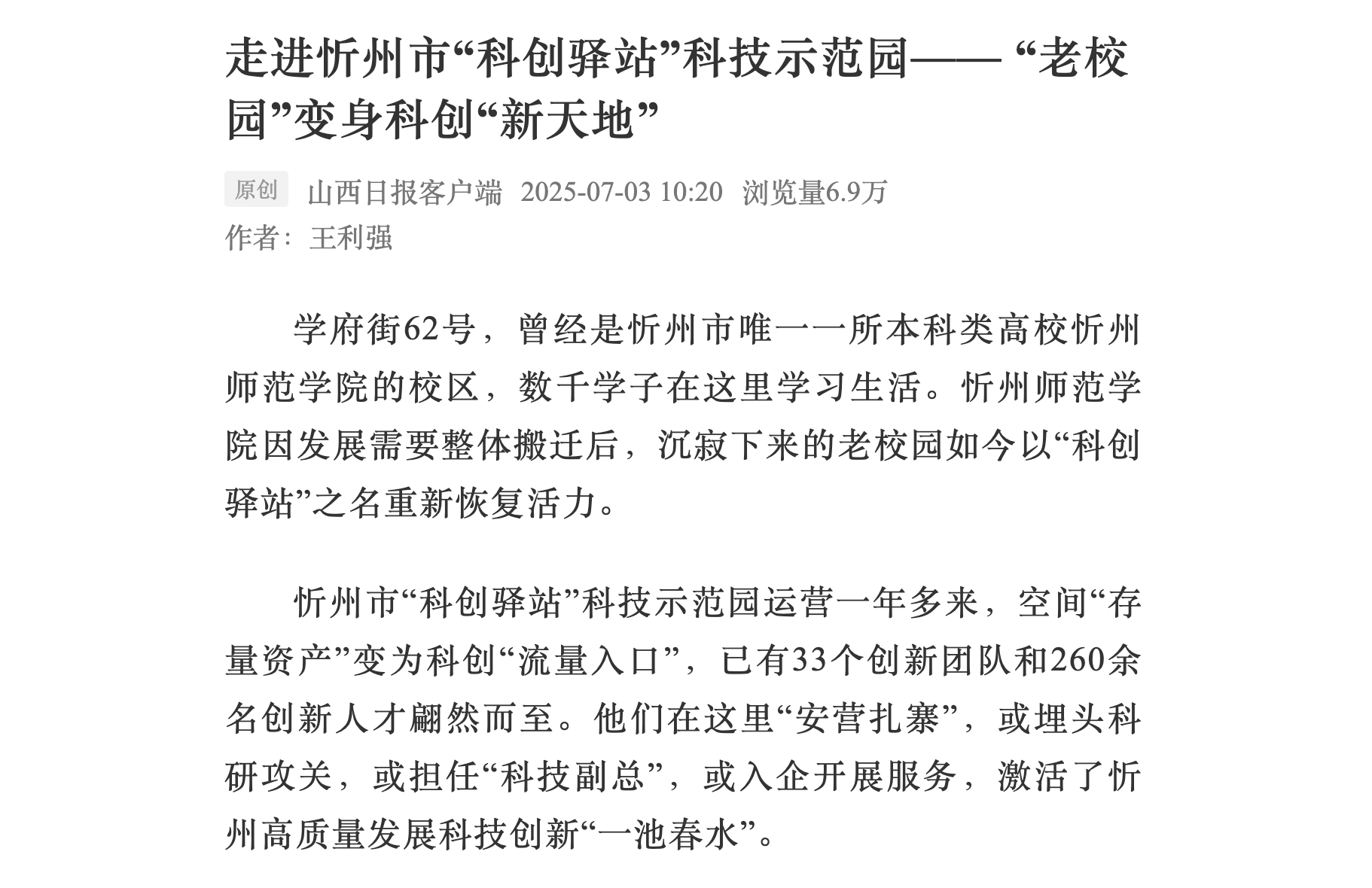 7月3日,山西日报报道太阳成官网作为忻州市“科创驿站”首批入驻高校,充分发挥科技优势和人才优势,以科技创新赋能产业发展,推动先进科技成果在忻州的转移转化与产业化推广。