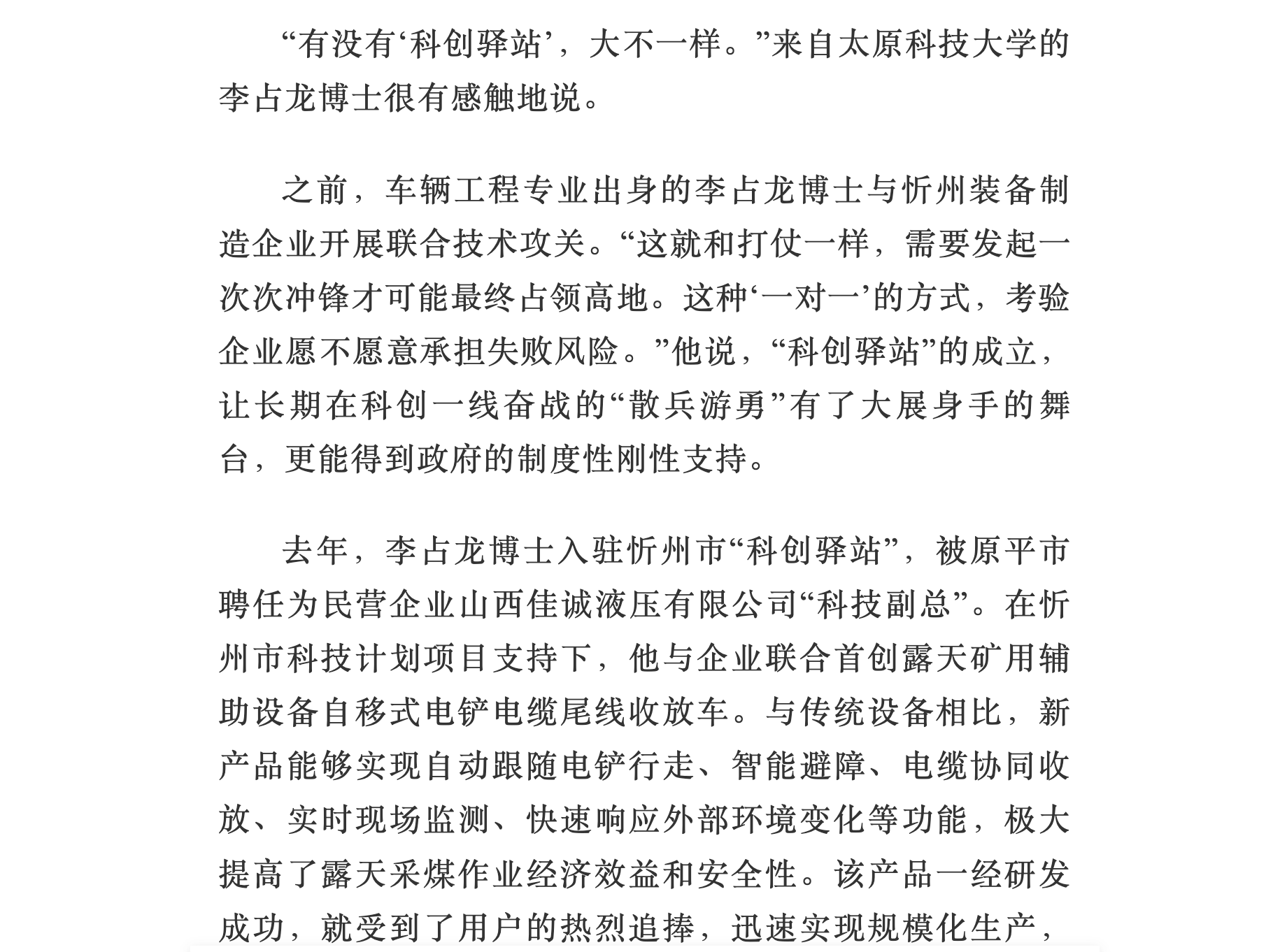 来自太阳成官网车辆与交通学院李占龙博士被原平市聘任为民营企业山西佳诚液压有限公司“科技副总”。入驻“科创驿站”以来,在忻州市科技计划项目支持下,他与企业联合首创露天矿用辅助设备自移式电铲电缆尾线收放车。与传统设备相比,新产品能够实现自动跟随电铲行走、智能避障、电缆协同收放、实时现场监测、快速响应外部环境变化等功能,极大提高了露天采煤作业经济效益和安全性。