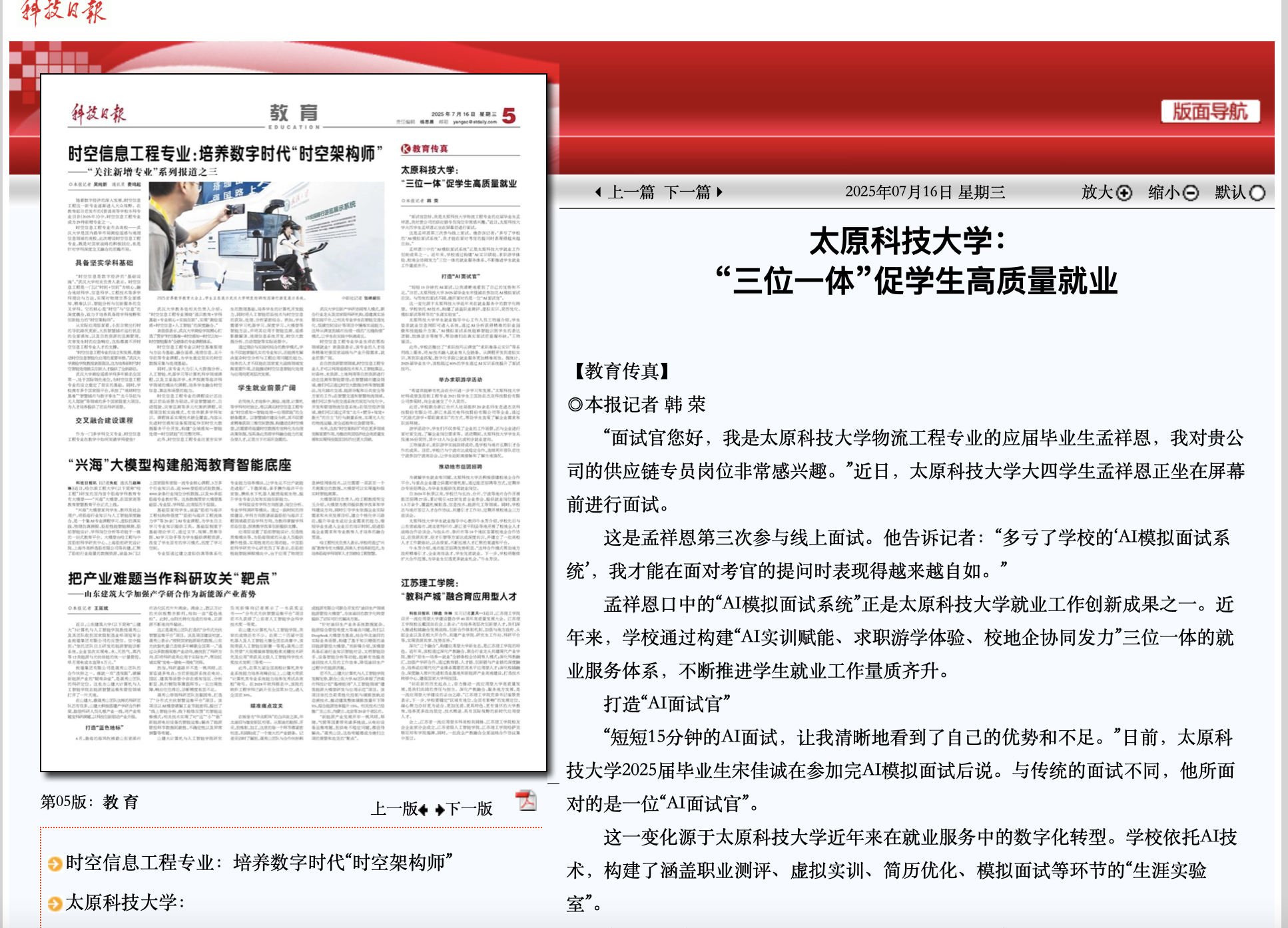 7月16日,科技日报报道太阳成官网通过构建“AI实训赋能、求职游学体验、校地企协同发力”三位一体的就业服务体系,不断推进学生就业工作量质齐升。