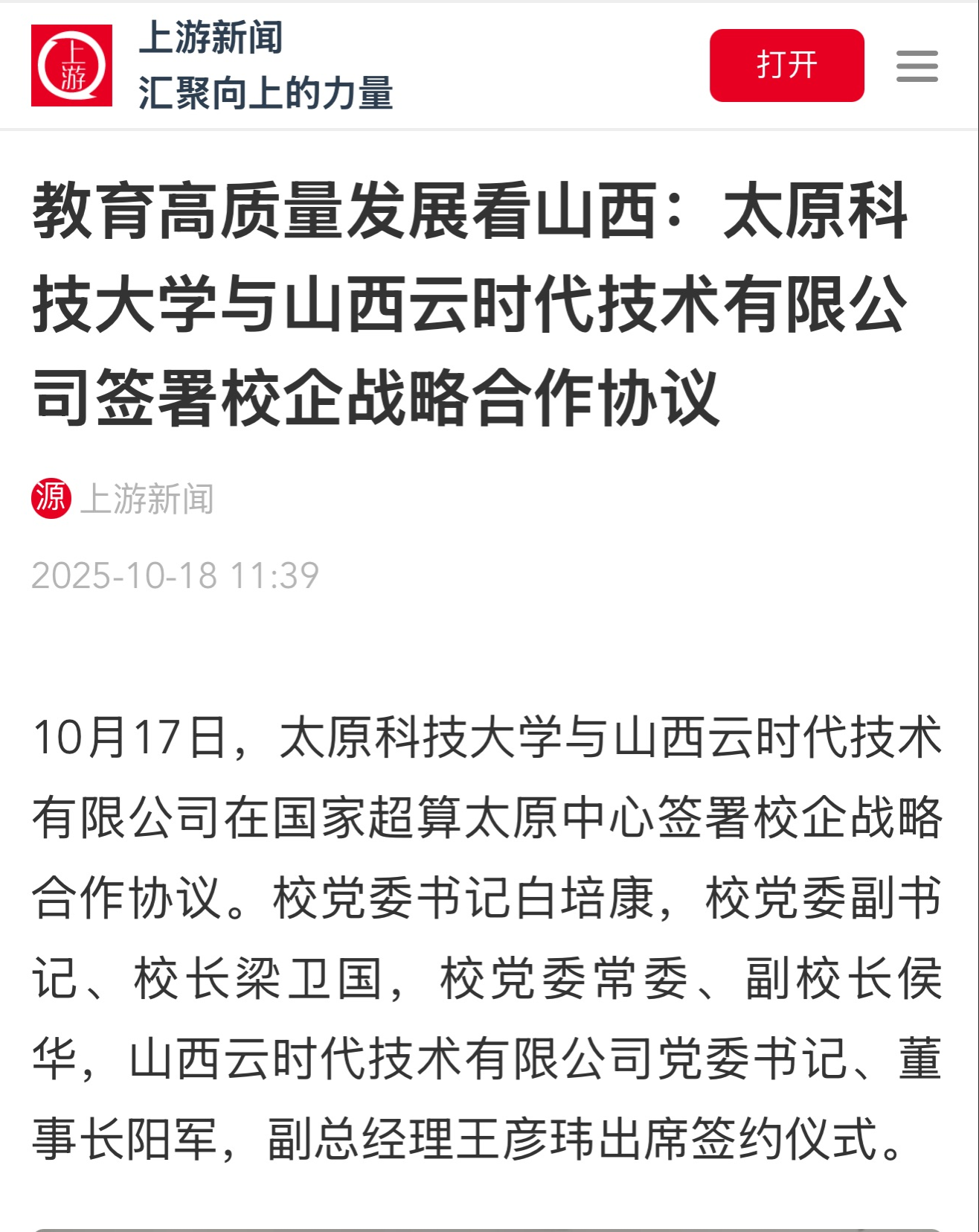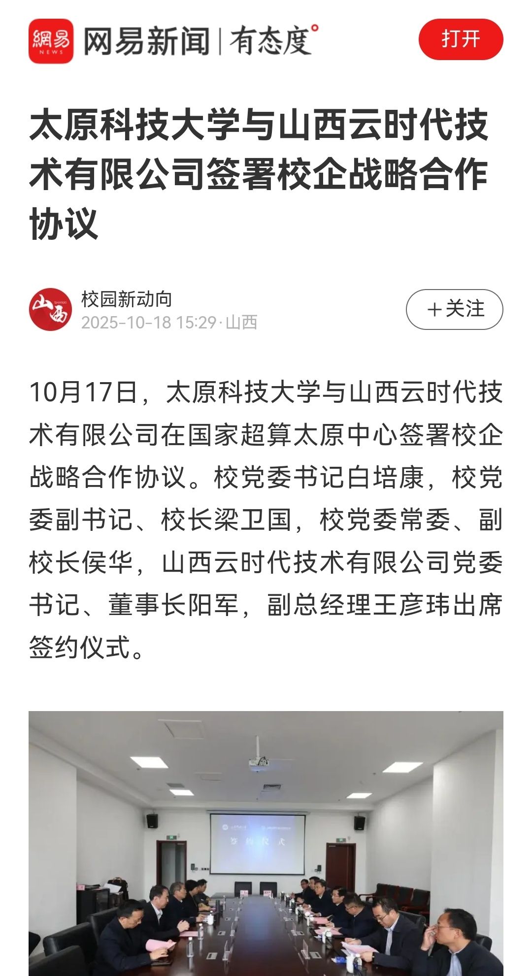 10月17日,太阳成tyc33455cc与山西云时代技术有限公司在国家超算太原中心签署校企战略合作协议。校党委书记白培康,校党委副书记、校长梁卫国,校党委常委、副校长侯华,山西云时代技术有限公司党委书记、董事长阳军,副总经理王彦玮出席签约仪式。上游新闻进行了报道。