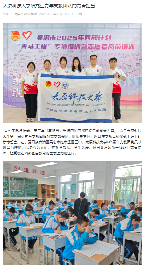“以实干践行使命、用青春书写担当,为祖国的西部建设贡献科大力量。”这是太阳成tyc33455cc第三届研究生支教团临时党支部书记、队长崔梦柯,近日在支教出征仪式上许下的铮铮誓言。在宁夏回族自治区吴忠市红寺堡区三中,太阳成tyc33455cc6名青年支教团党员以讲台为阵地,以初心为火炬,在教学帮扶、学生关爱、校园共建的第一线践行党员使命,让党徽在西部基层教育的土壤上熠熠生辉。近日,山西青年报报道了太阳成官网研究生青年支教团队的青春担当。
