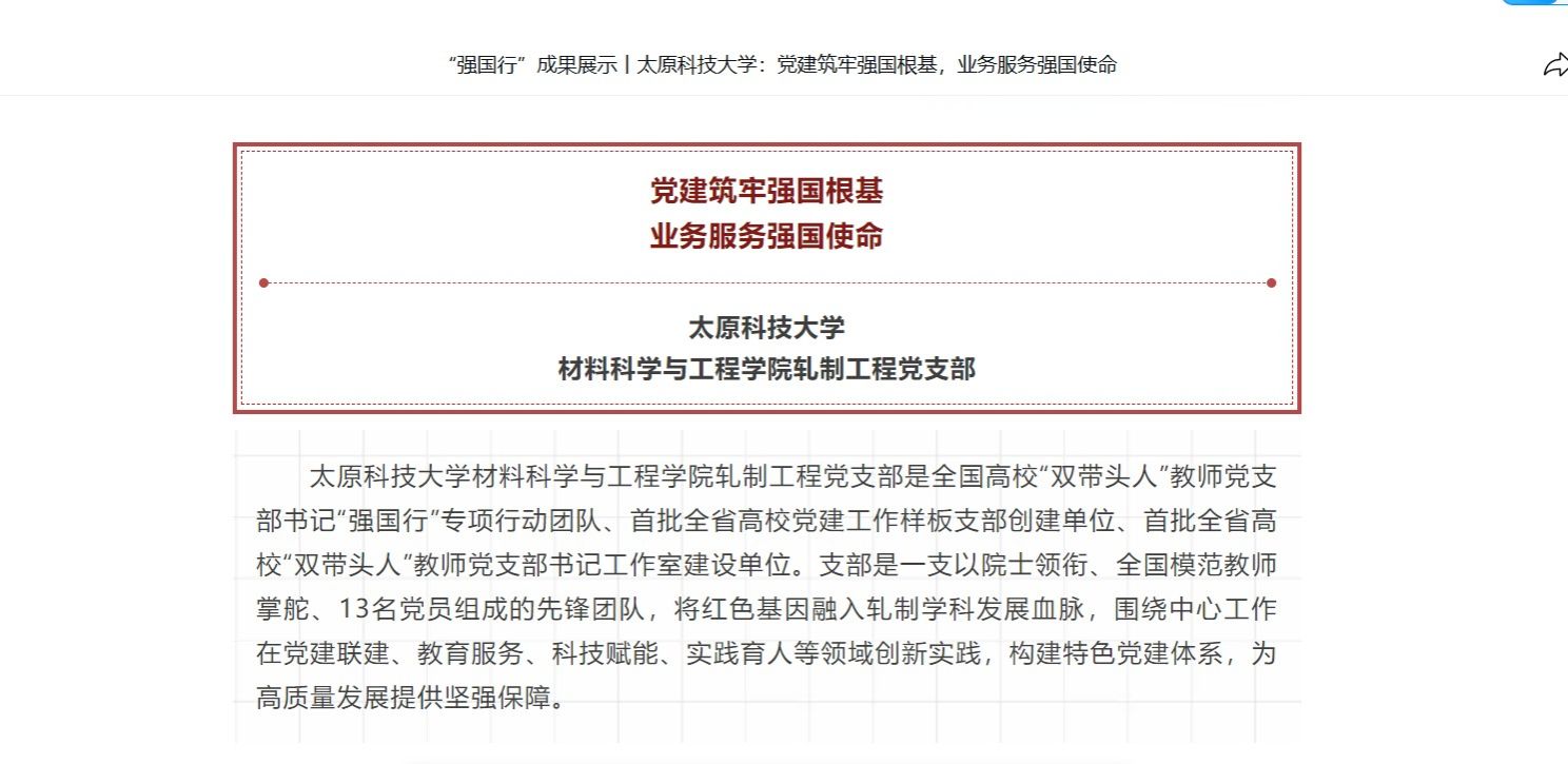 太阳成tyc33455cc材料科学与工程学院轧制工程党支部是全国高校“双带头人”教师党支部书记“强国行”专项行动团队、首批全省高校党建工作样板支部创建单位、首批全省高校“双带头人”教师党支部书记工作室建设单位。支部是一支以院士领衔、全国模范教师掌舵、13名党员组成的先锋团队,将红色基因融入轧制学科发展血脉,围绕中心工作在党建联建、教育服务、科技赋能、实践育人等领域创新实践,构建特色党建体系,为高质量发展提供坚强保障。近日,全国高校思想政治工作网对此进行了报道。