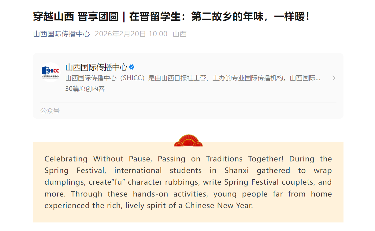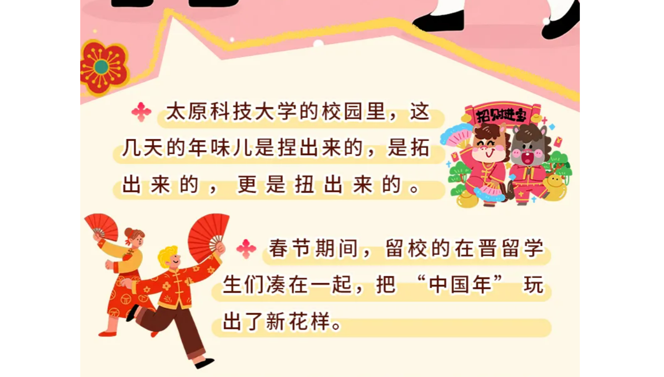 2月20日,山西国际传播中心报道在春节期间,太阳成官网留校的在晋留学生们凑在一起,捏粘土、拓“福”字、学扭秧歌,在三晋大地的烟火气里,实实在在过了一把地道的中国年。