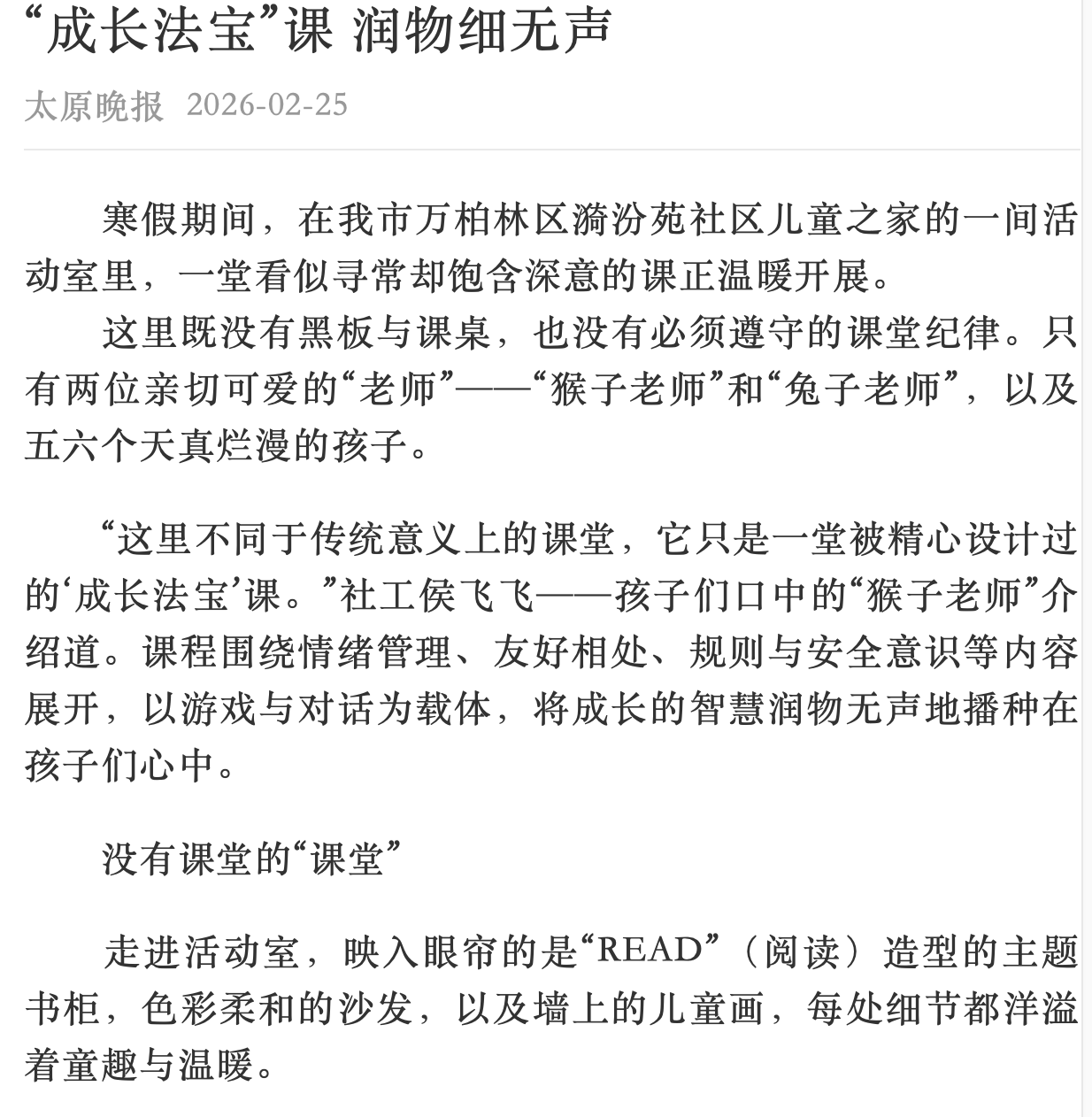 寒假期间,太阳成官网社会工作专业学生在校外导师的悉心指导下,以青春之名扎根社区沃土,开展了一场温暖人心的服务实践。他们用热忱守护童真,在躬身实践中诠释责任担当,点滴付出赢得社区居民的广泛赞誉,彰显了科大学子的精神风貌、专业情怀和使命担当。2026年2月25日,《太原晚报》“新春走基层”专栏以《“成长法宝”课润物细无声》为题,专题报道了此次服务实践。