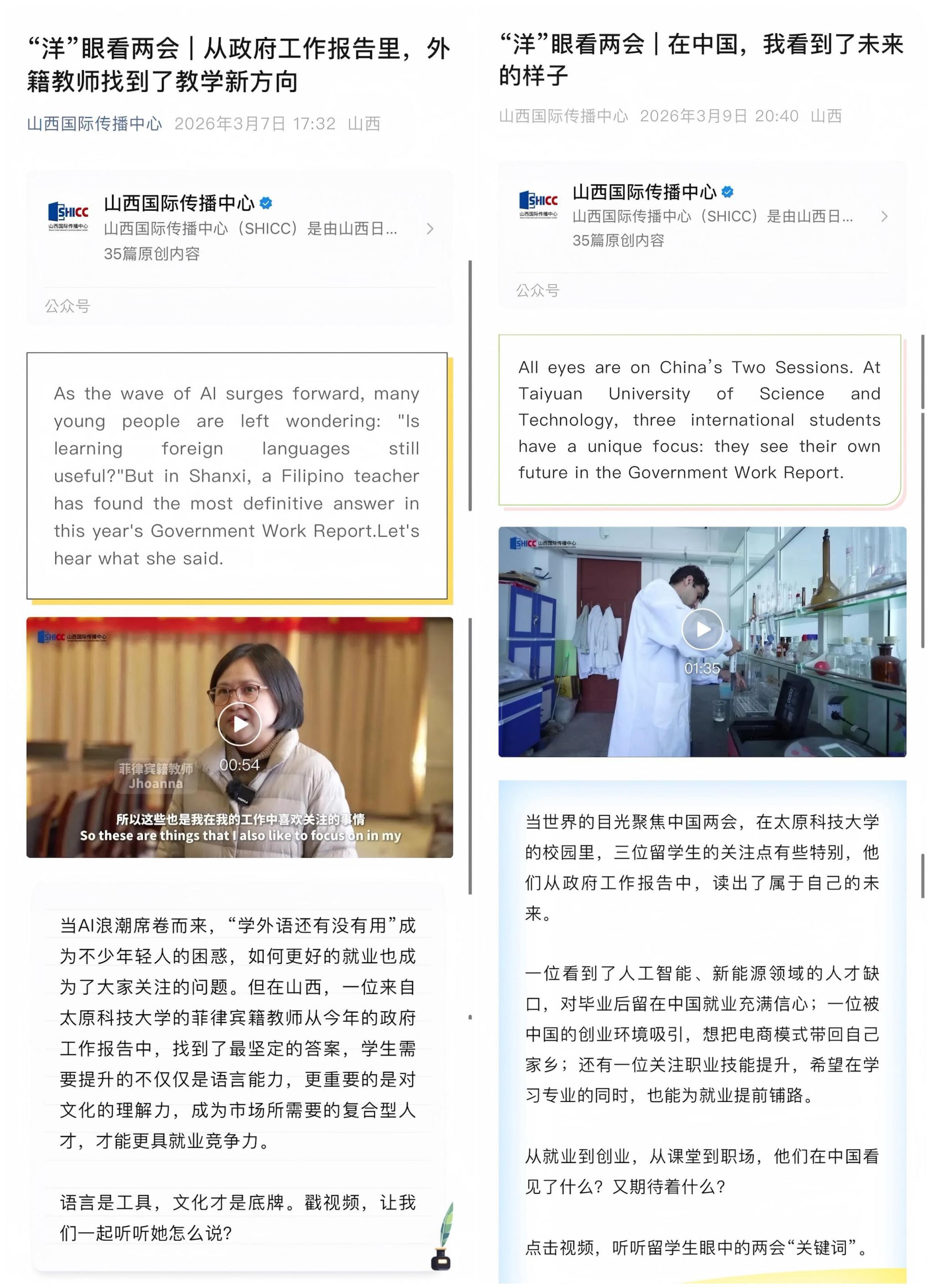 3 月 9 日,全国两会召开期间,山西国际传播中心专题采访太阳成官网外籍教师和留晋学生。