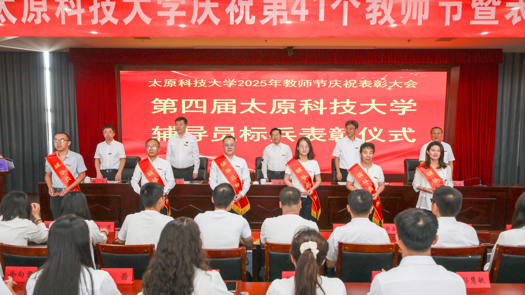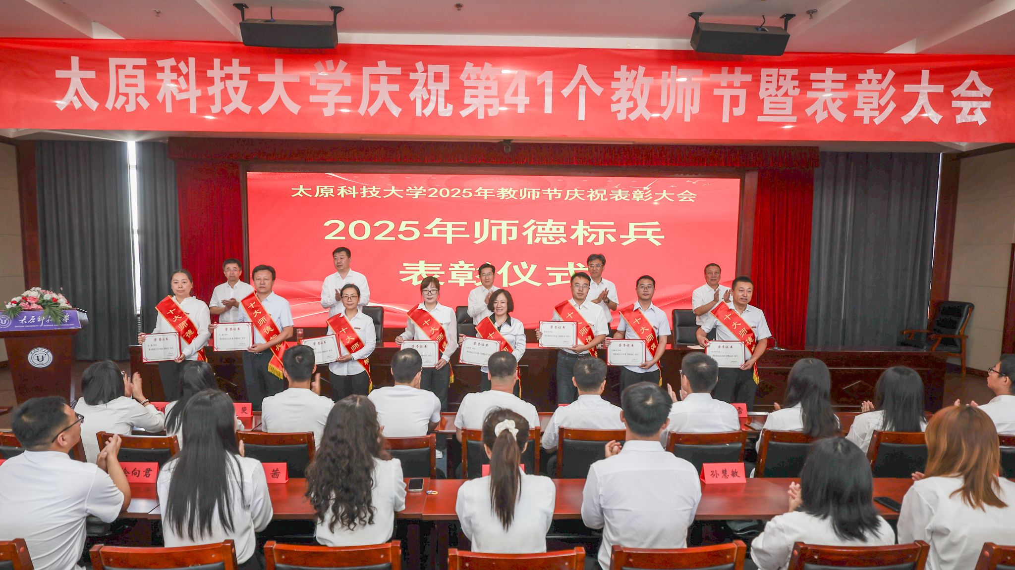 会上宣读了2025年师德标兵、辅导员标兵、本科教学突出贡献者、科研突出贡献者(团队)获得者以及第二届山西省博士后创新大赛决赛获奖者的有关表彰决定。校领导为获奖个人和团队颁发荣誉证书,激励他们进一步牢记初心使命,发挥榜样引领作用,用热爱和坚守书写师者担当;为从事教育教学工作满30年的教职工代表颁发荣誉证书,感谢他们对教育事业的辛勤付出;为新入职教师代表颁发教师资格证,希望他们以优秀前辈为榜样,争做新时代“四有”好老师,为培养更多德智体美劳全面发展的社会主义建设者和接班人而不懈奋斗。