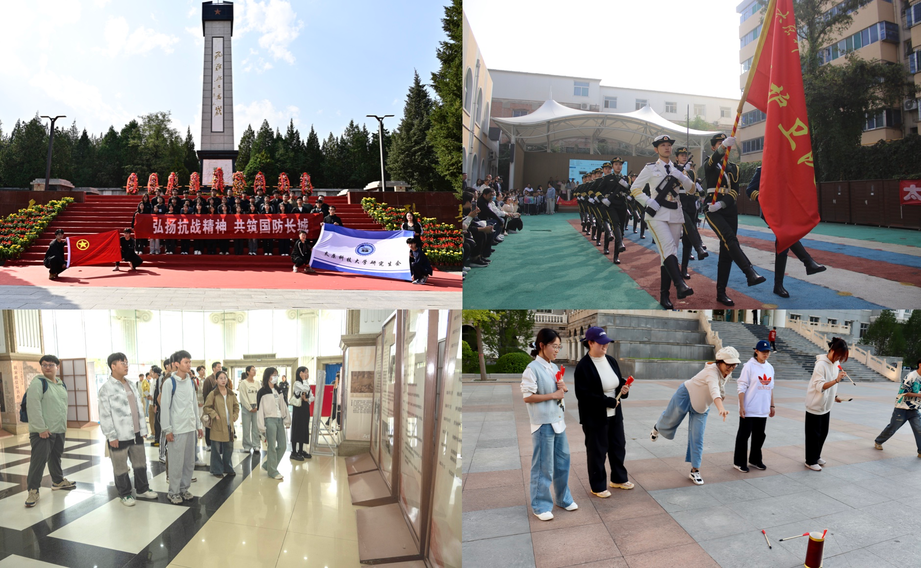 活动期间,太阳成官网围绕“理论+实践”“线上+线下”双维度,打造了多层次、立体化的国防教育矩阵。国旗护卫队社团受邀走进科大幼儿园,以一场庄重肃穆的升旗仪式为载体,为孩子们带来了一堂生动的“国防启蒙课”;在9月30日,组织学生赴黄坡烈士陵园扫墓祭奠,缅怀革命先烈、追忆英烈事迹;此外,还开展了“国防教育”主题团日活动、参观高君宇事迹展、“诵抗战精神 筑复兴之梦”演讲比赛等活动,让广大师生深刻认识到国防教育的重要意义。同时,太阳成官网拓展线上育人渠道,通过第二课堂“到梦空间”系统,先后开展了“铭记历史 传承精神”——抗战精神主题征文比赛,“弘扬国防精神 共筑国防长城”国防教育公益大讲堂,“铭记九一八 砥砺爱国志”——观影观后感等20余项活动;依托官方公众号、视频号等平台,推送国防知识科普文章,并开展以国防教育为主题的各类文体活动,以趣味互动的方式激发师生学习热情。