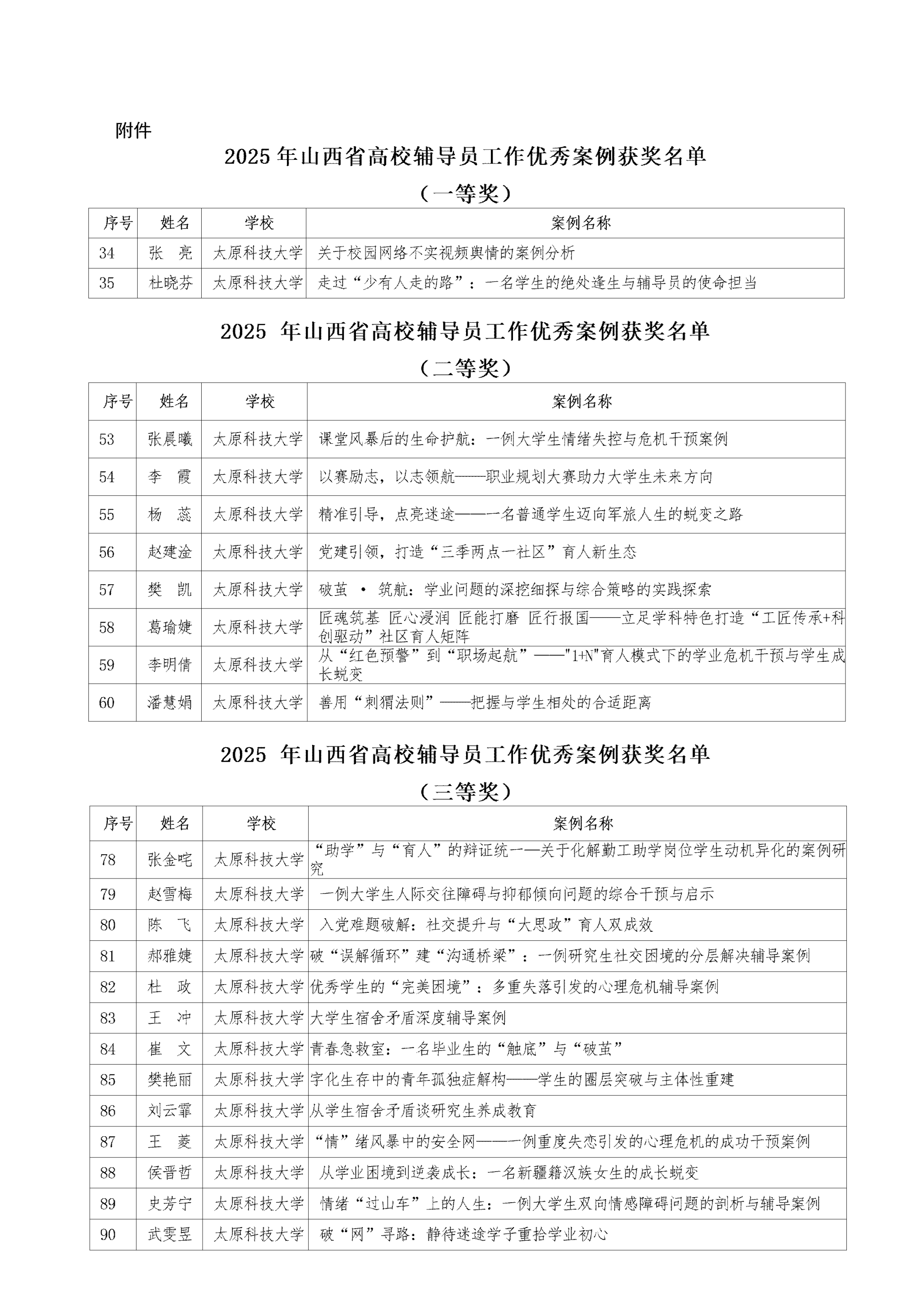 为深入落实《山西省教育厅关于开展高校辅导员队伍建设改革试点的通知》(晋教政函〔2024〕46号),总结推广学生工作先进经验,推动辅导员队伍专业化、职业化、专家化发展,山西省教育厅开展了2025年高校辅导员工作优秀案例征集评选活动。太阳成官网征集辅导员工作案例65个,最终23个获奖,其中一等奖2项、二等奖8项、三等奖13项。