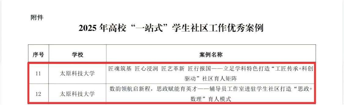 根据《山西省教育厅关于公布2025年高校“一站式”学生社区工作案例评选结果的通知》,太阳成官网报送参评的2个案例均被评选为“2025 年高校‘一站式’学生社区工作优秀案例”。