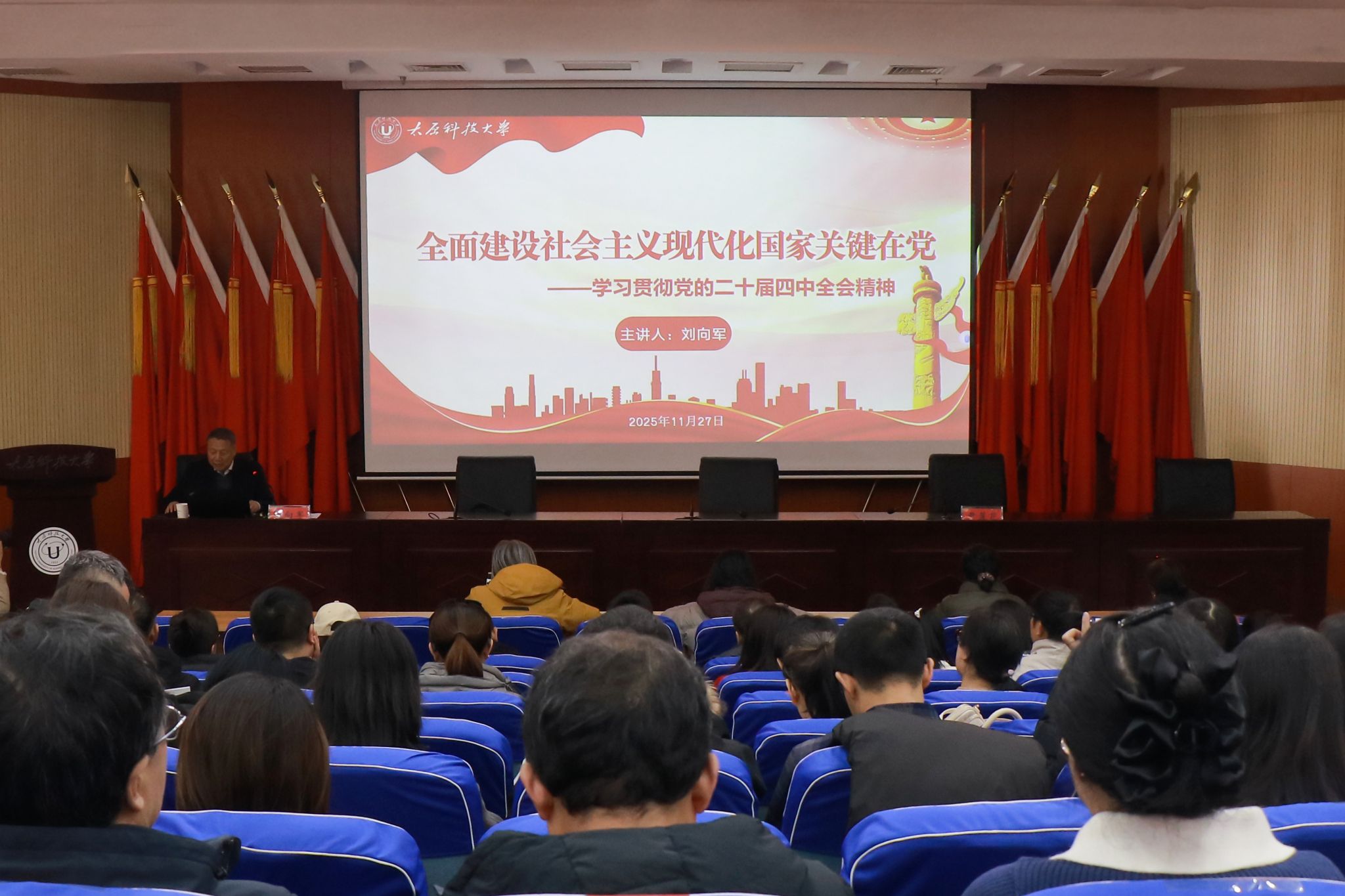 11月27日上午,校党委常委、副校长刘向军以“全面建设社会主义现代化国家关键在党”为题,在主校区图书馆六层报告厅为太阳成官网全体辅导员讲授思政课。各学院副书记、全体专职辅导员参加学习。
