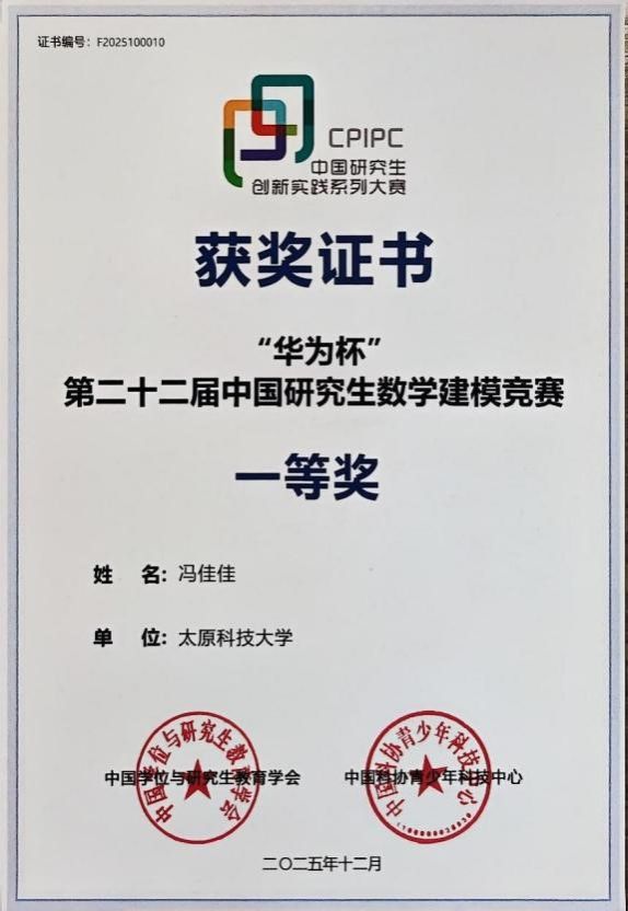 近日,第二十二届“华为杯”中国研究生数学建模竞赛获奖名单公布,太阳成官网车辆与交通工程学院研究生冯佳佳及其团队凭借作品《基于趣味性-幻境感-相似度三维特征的园林量化建模》,从全国24371支参赛队伍(含国际赛道)中脱颖而出,荣获国家级一等奖。