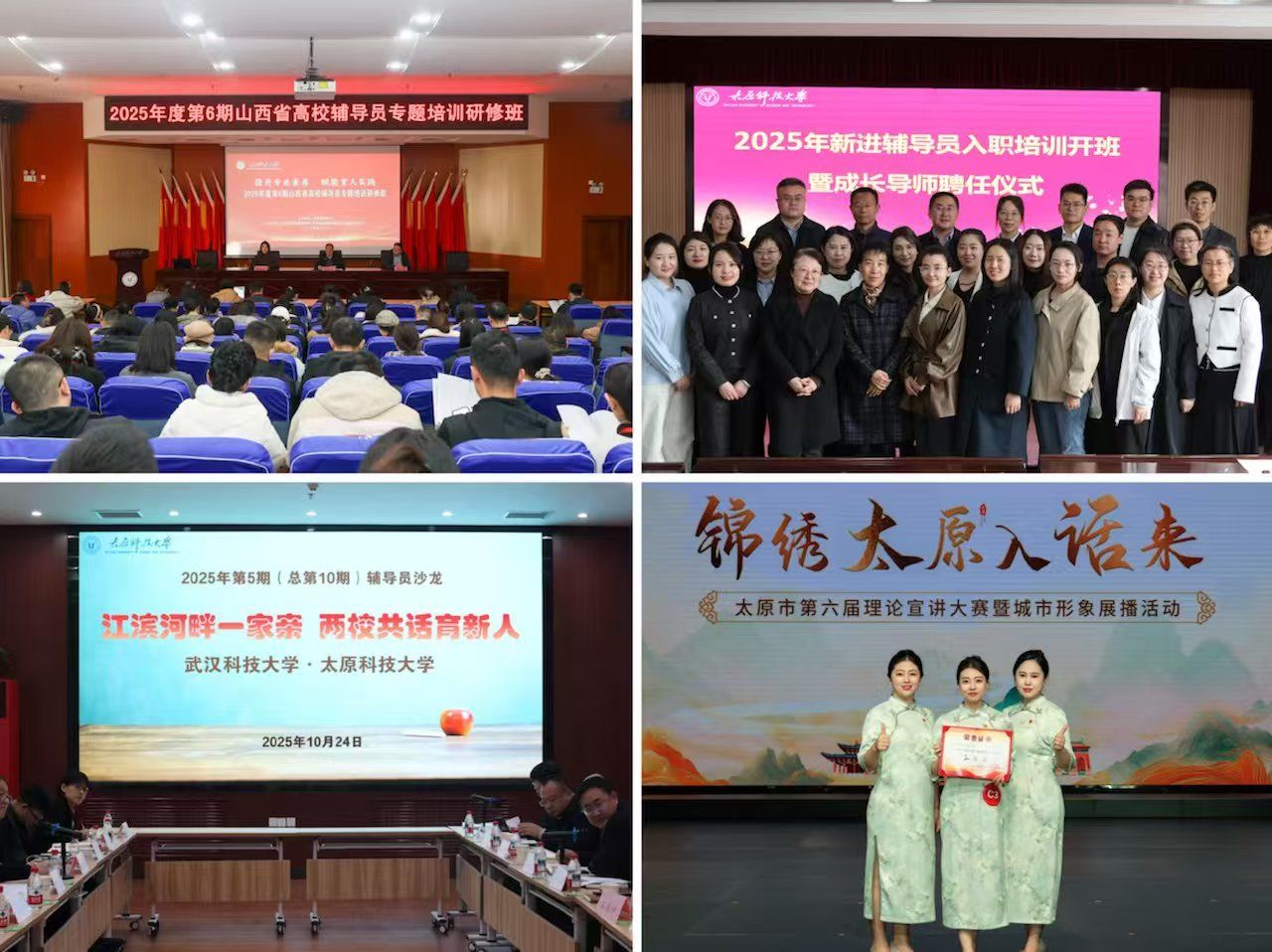 多措并举精准赋能,建强辅导员队伍。紧扣辅导员队伍建设,构建系统化培育提升体系。全年组织辅导员专题培训15场、参训655人次,举办辅导员沙龙活动7期,选派45名辅导员参加国家及省级培训,成功承办2025年第6期山西省高校辅导员专题培训研修班。强化理论宣讲团建设,凝练固定宣讲主题10个、精品作品5部,开展宣讲35场,线下覆盖超2000人次,宣讲成员斩获市、区级竞赛奖项。推进辅导员工作室建设,建成省级工作室1个、校级工作室10个;23项工作案例获评山西省高校辅导员优秀案例,学校成功加入中国教育电视台高校辅导员联盟,队伍专业化水平持续提升。